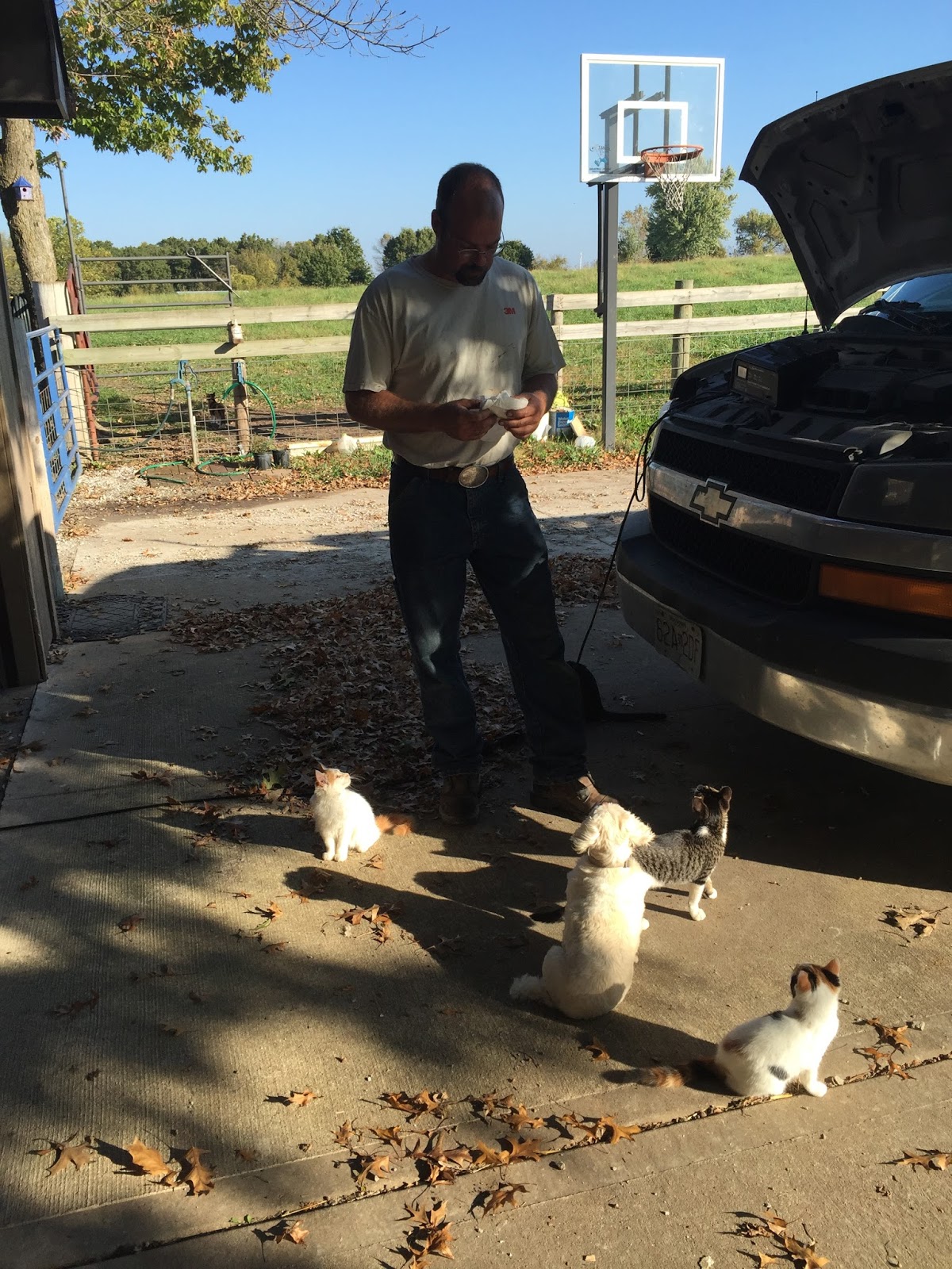Tim got called out to work so he was getting his van started. In the meantime, he was eating his breakfast and all the animals came up to him wanting it.